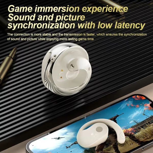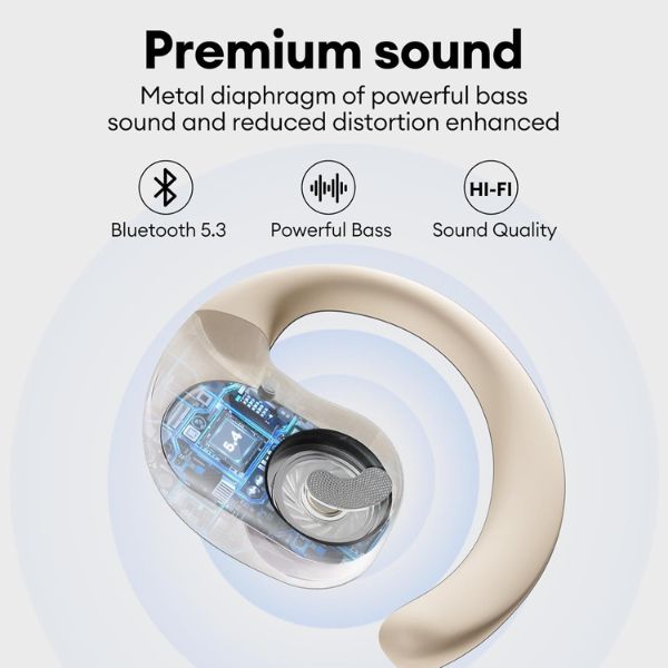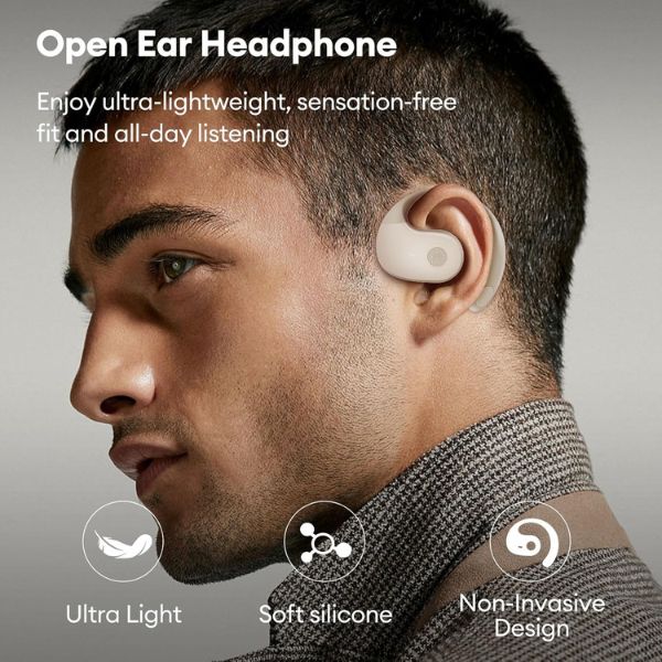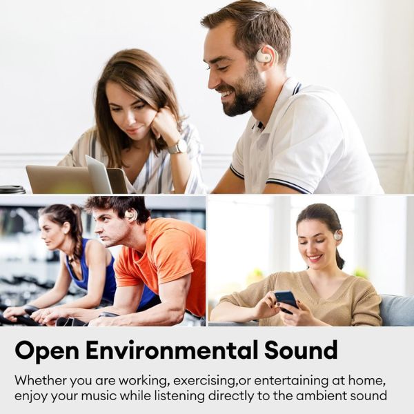 تمتاز سماعات بتصميم مفتوح لا يدخل الأذن، مما يخفف الضغط ويحمي من أضرار السمع. فهي تثبت بلطف على الأذن دون ألم، وتمنحك تجربة استماع مريحة لساعات طويلة