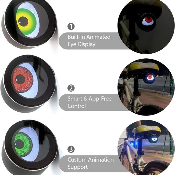 يتميز هذا الضوء الخلفي للدراجات بعرض رسومي متحرك لعيون تعبيرية مذهلة، تضيف طابعًا فريدًا وممتعًا أثناء قيادتك. سواء كنت تقود ليلًا أو في أوقات الغروب
