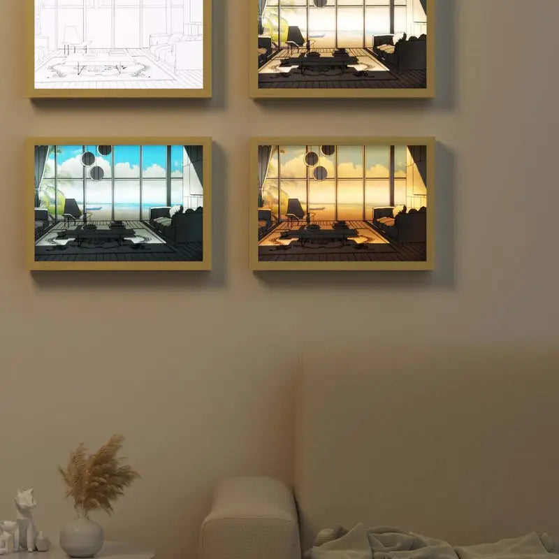لوحة مضيئة بتصميم مستوحى من الأنمي الياباني تضيف لمسة جمالية. خطوط سوداء وبيضاء مع إضاءة تشبه أشعة الشمس لعالم فني رائع.
