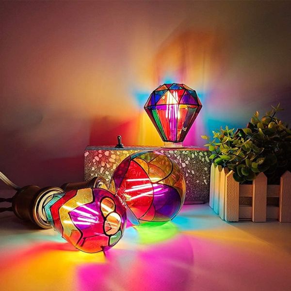 مصباح فريد بلون زجاجي ملوّن يدويًا. يضيء بألوان دافئة وجذّابة تضيف لمسة رومانسية لأي مساحة